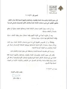 أصدر رئيس الحكومة اللبنانية تعميمًا الى جميع الادارات والمؤسسات العامة والبلديات بشأن الالتزام بتطبيق القوانين التي ترعى استعمال الاملاك العامة والاماكن الاثرية والسياحية والمباني الرسمية، طلب فيه من جميع الإدارات والمؤسسات العامة والبلديات واتحاداتها والأجهزة المعنية كافة التشدّد في منع استعمال الاماكن العامة البرية والبحريّة والمعالم الأثرية والسياحية أو تلك التي تحمل رمزية وطنية جامعة، وذلك قبل الحصول على التراخيص والاذونات اللازمة من الجهات المعنيّة وفقاً للأصول.